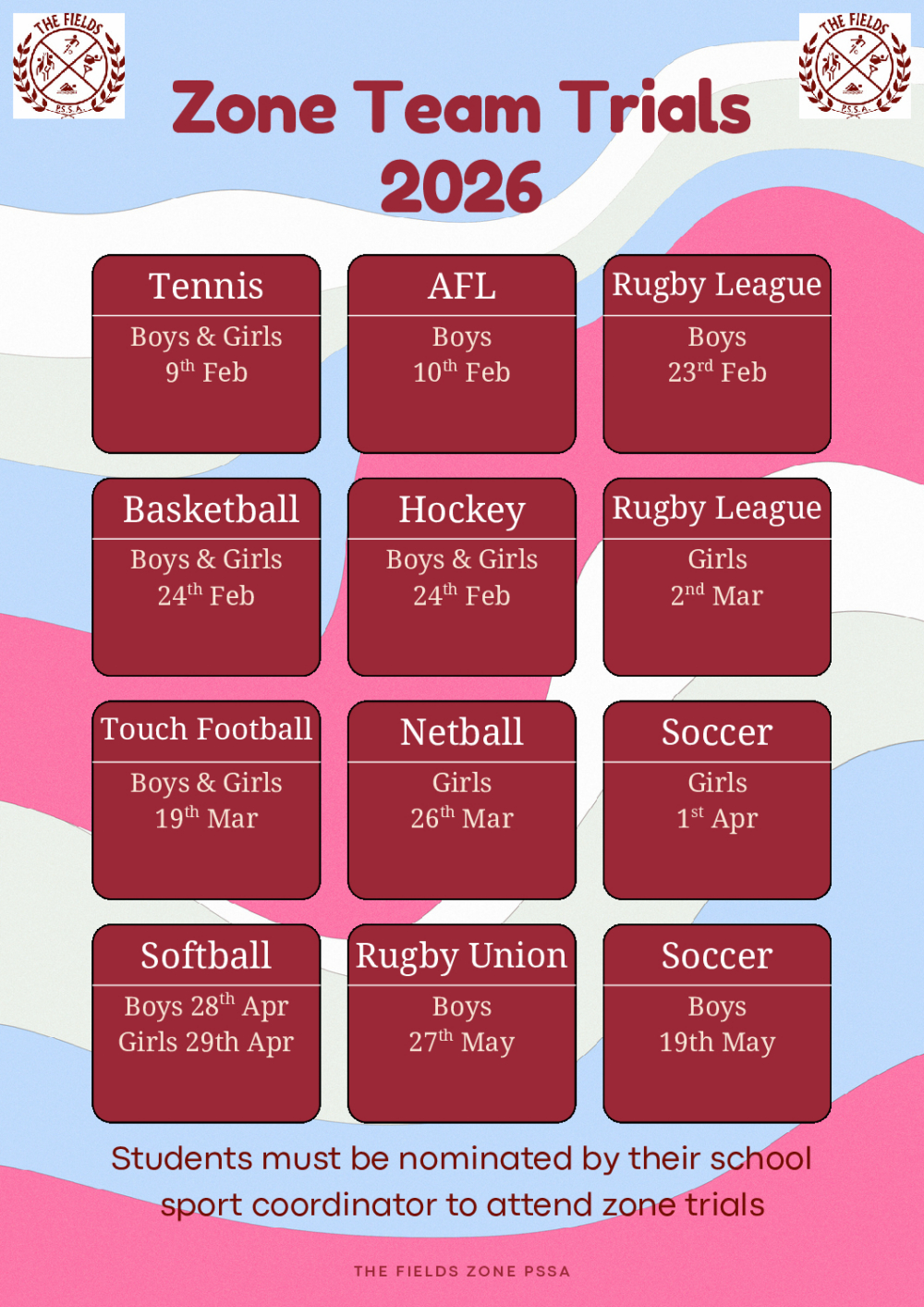 Zone Team Trial dates Upcoming Zone Team Trials: February 9th February – Tennis 10th February – AFL (Boys)...
